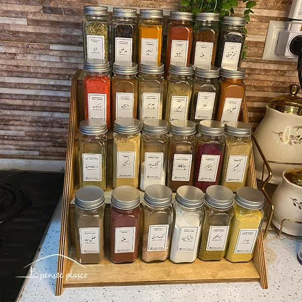 استند پلکانی چوبی یکی از زیباترین محصولات پنسی پلاسکو است که شما عزیزان می توانید آن را صورت تک یا همراه با شیشه های ادویه درب فلزی یا درب چوبی تهیه کنید.